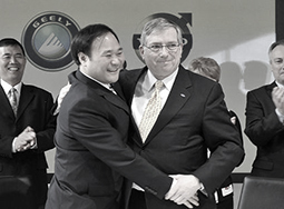 8月2日,吉利控股集团董事长李书福(前左)和福特首席财务官刘易斯·布思(前右)在英国伦敦共同出席交割仪式。中国浙江吉利控股集团有限公司8月2日在伦敦宣布,已经完成对美国福特汽车公司旗下沃尔沃轿车公司的全部股权收购......